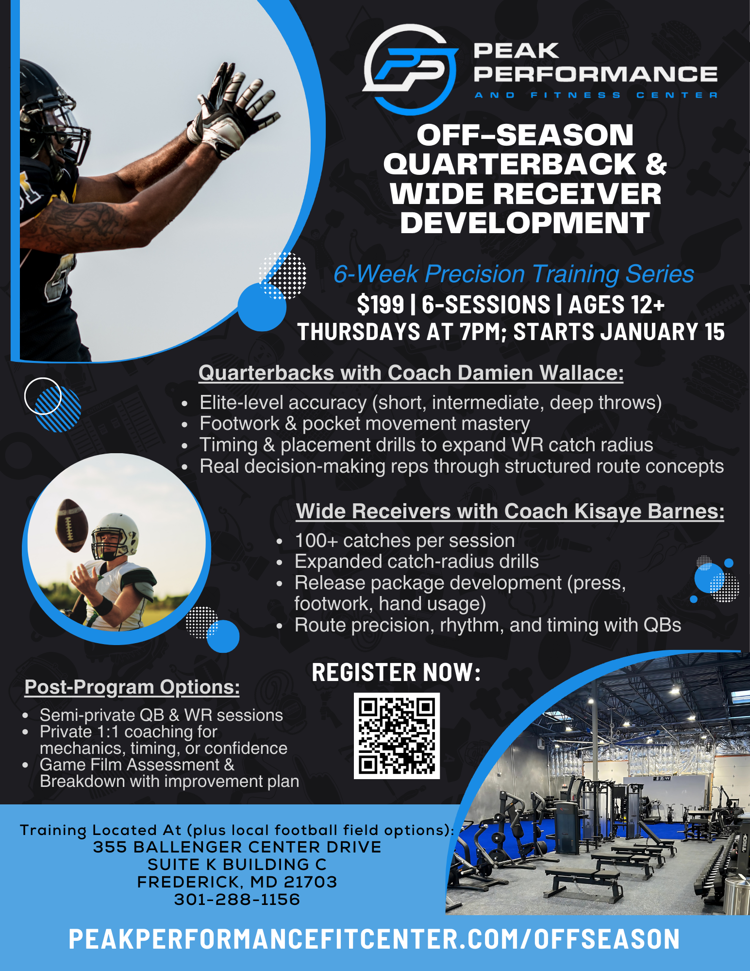 Location: Peak Performance & Fitness Center + Local Football Field (weather permitting)